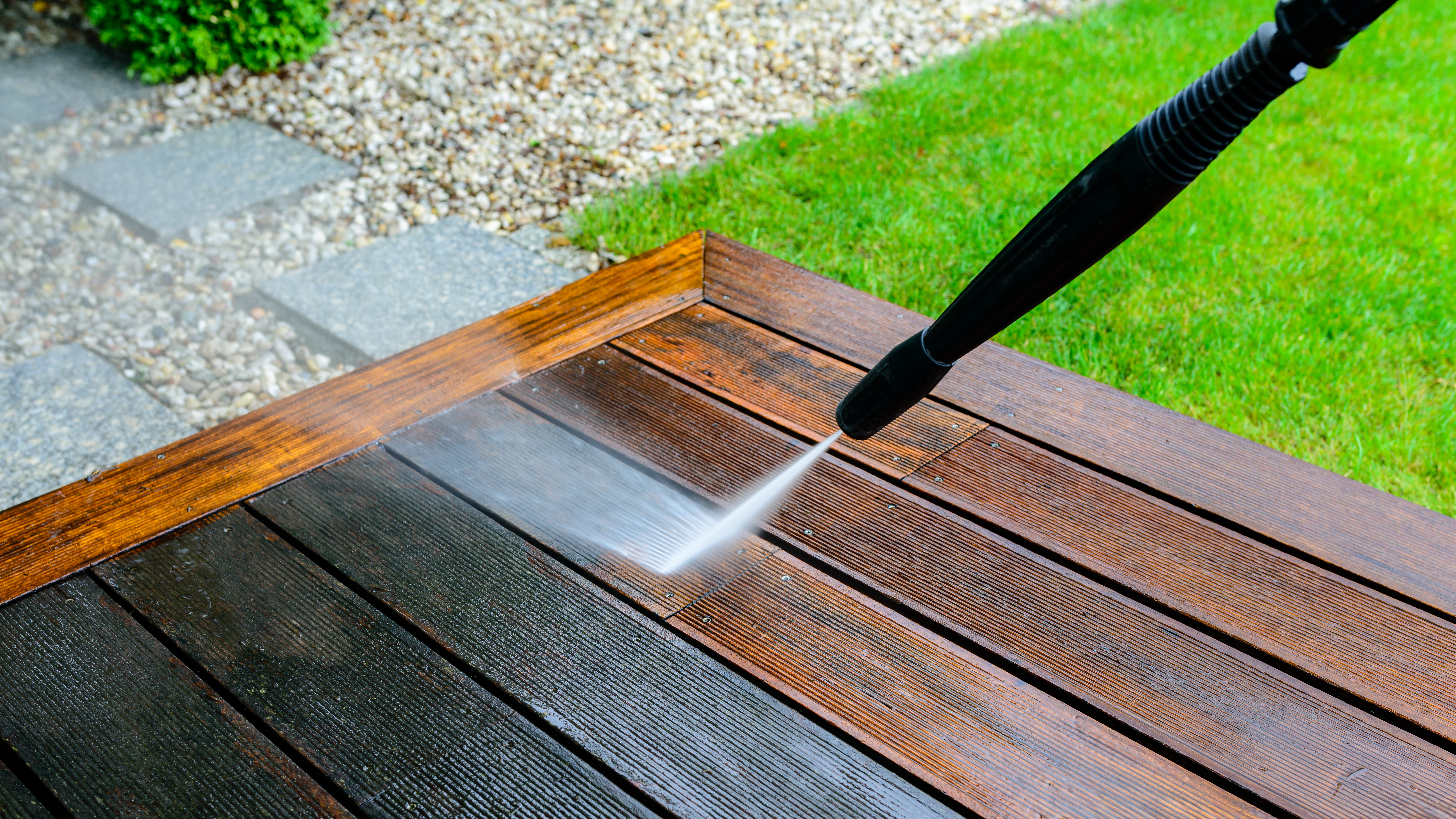 Nettoyage des allées en pavé, des perrons en béton ou des terrasses en bois avec une machine à pression.